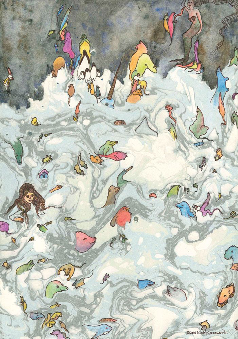 With her work focused on the idea of embracing change; she uses methods such as marbling to create a base for her images, then using traditional techniques of drawing, ink and paint washes picks out details to promote the telling of the tale through illustrations filled with narrative, allure and creatures from around the allegorical world.