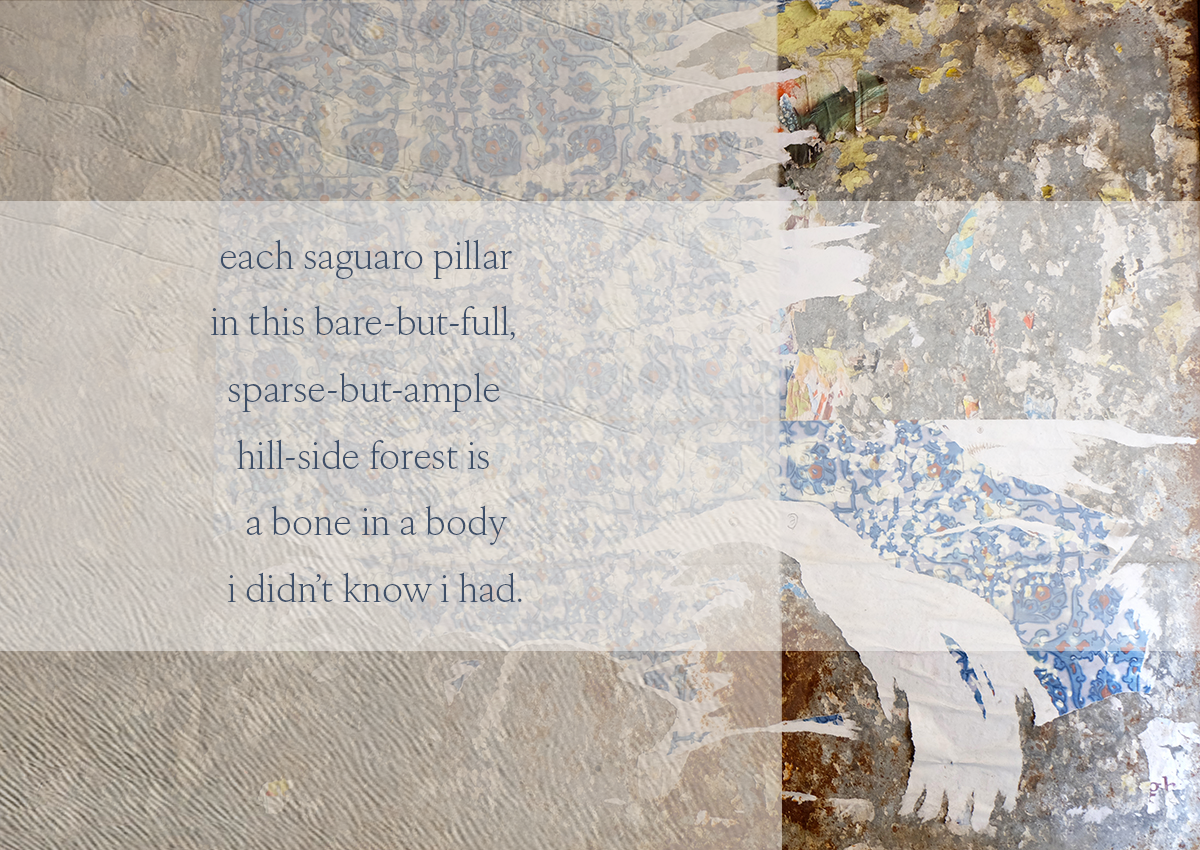 each saguaro pillar in this bare-but-full, sparse-but-ample hill-side forest is a bone in a body i didn’t know i had. whispers surround me, their austere guardian... Read more.