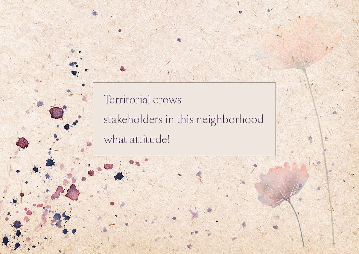 Territorial crowsstakeholders in this neighborhoodwhat attitude!objecting to the wandering shoppercawing and diving the saturated dog I've had arguments with... Read more.