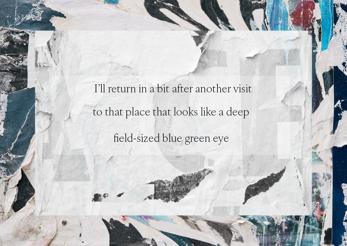 I’ll return in a bitafter another visitto that placethat looks like a deepfield-sized blue greeneye peeringout of the landinviting wonder backinto another oneof... Read more.